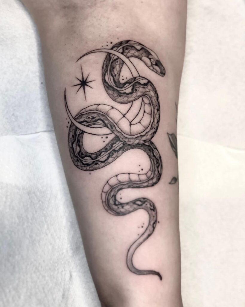 This tattoo features a detailed serpent gracefully coiled around a crescent moon, with a star shining nearby.