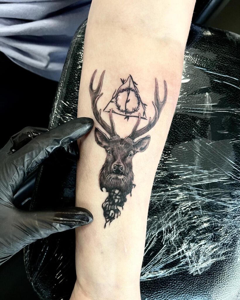 This tattoo features a detailed stag head with powerful antlers, beneath a mystical triangular symbol intertwined with branches.