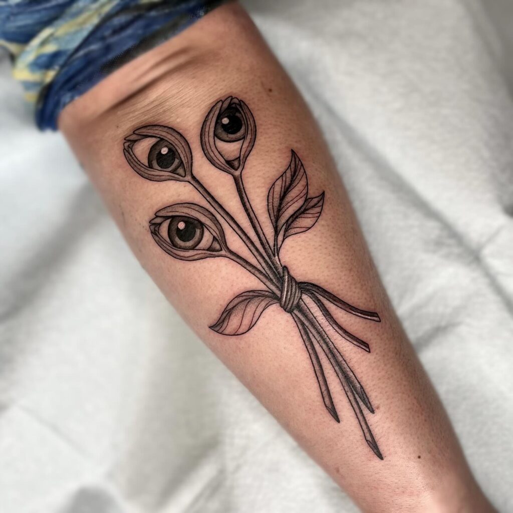 This tattoo depicts three flowers, but instead of petals, each bloom holds a realistic eye at its center. The stems are tied together, resembling a bouquet, while leaves accent the design with natural detail.