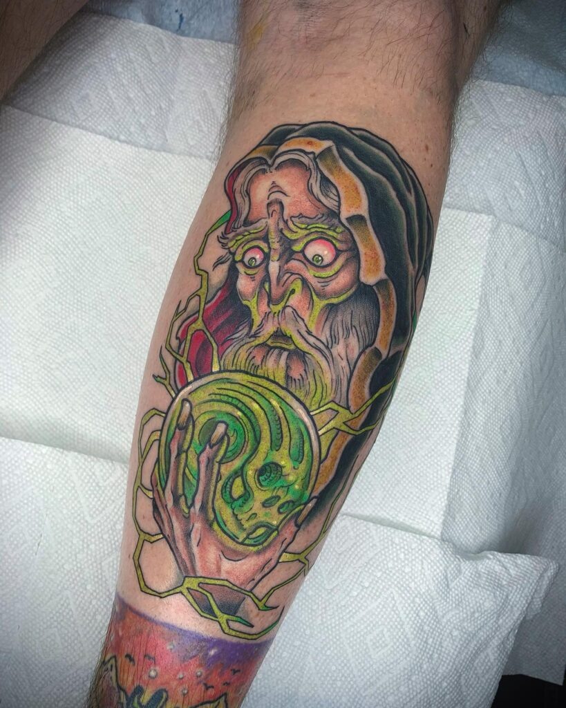 This tattoo depicts a powerful wizard holding a glowing green orb, his intense gaze radiating wisdom and mystery.