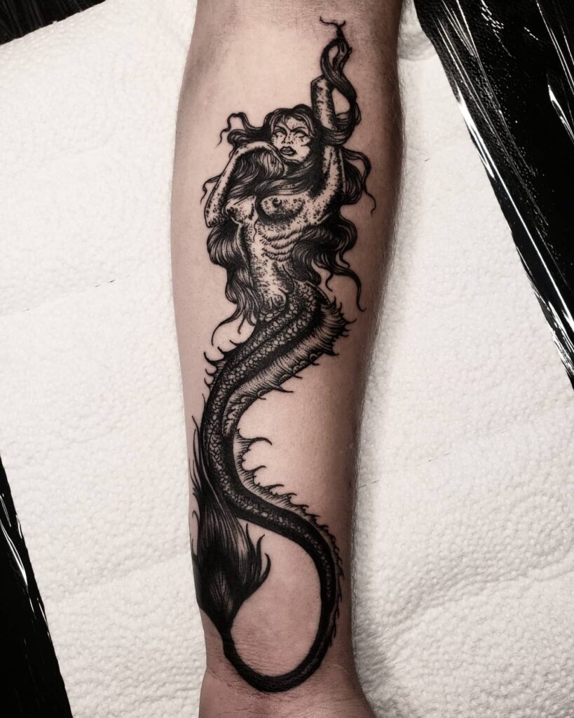 This tattoo portrays a haunting siren with a powerful presence, merging human beauty with a monstrous serpentine form.