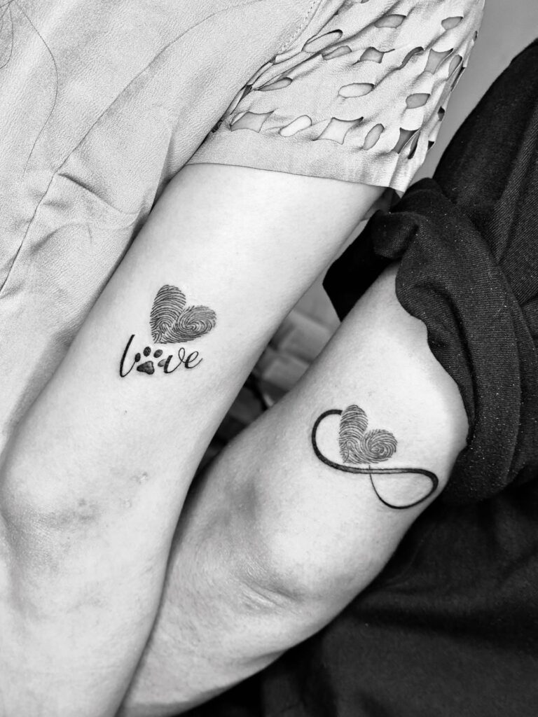 One partner’s tattoo shows a fingerprint heart above the word “love,” with the o replaced by a tiny fingerprint.