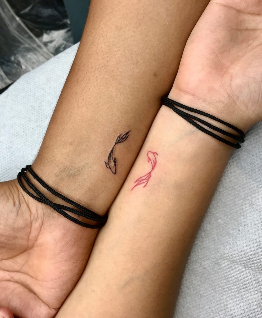 These tattoos feature a pair of minimalist koi fish, one inked in black and the other in red, placed on each partner’s wrist.