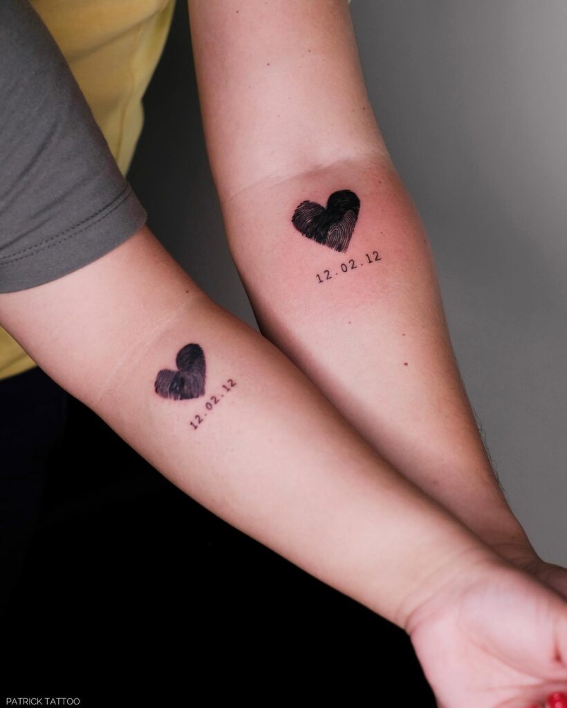 This couple tattoo combines fingerprint hearts with a meaningful date underneath.