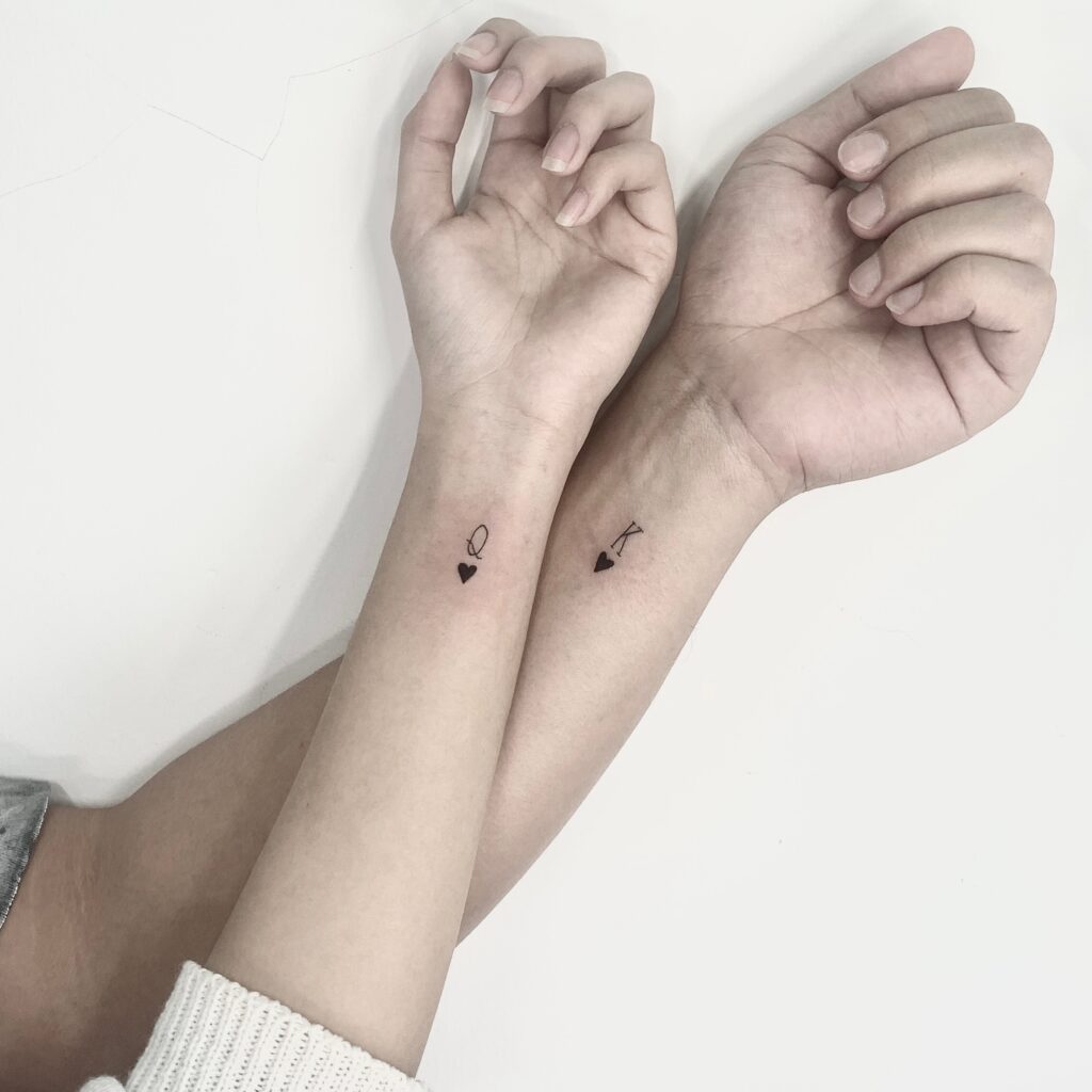This couple tattoo takes inspiration from playing cards, pairing a K with a heart for the king and a Q with a heart for the queen.
