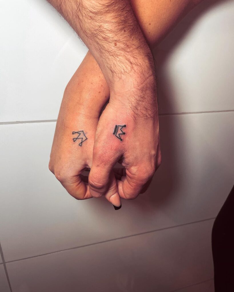 The minimal style keeps the tattoos subtle while still meaningful. Together, they reflect balance between partners, celebrating each as a king or queen in the relationship.