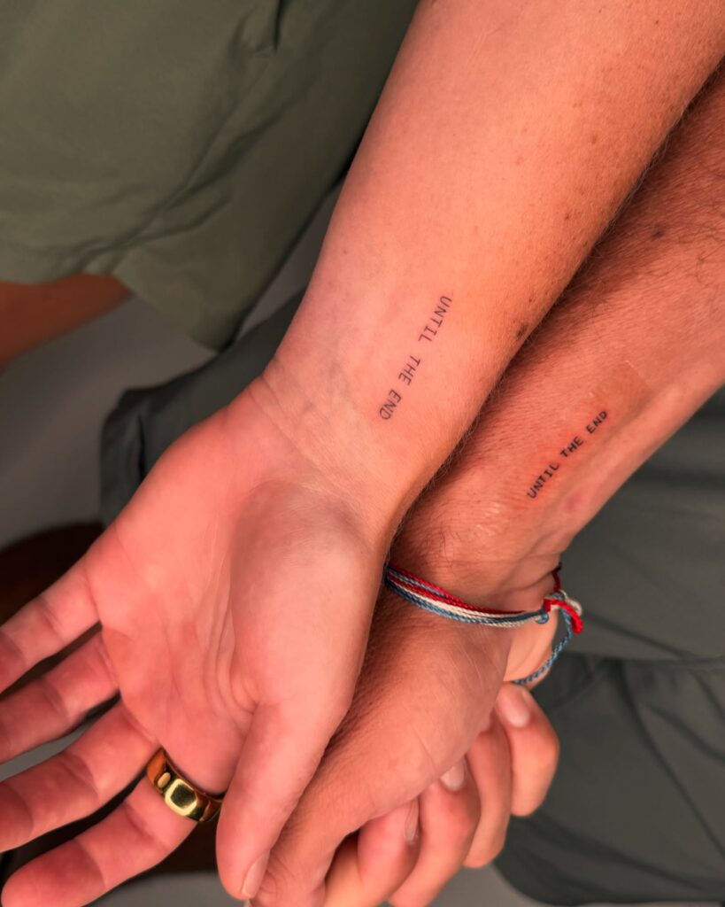 These matching tattoos feature the phrase “Until the End” inked in a clean, minimal font on each partner’s forearm.