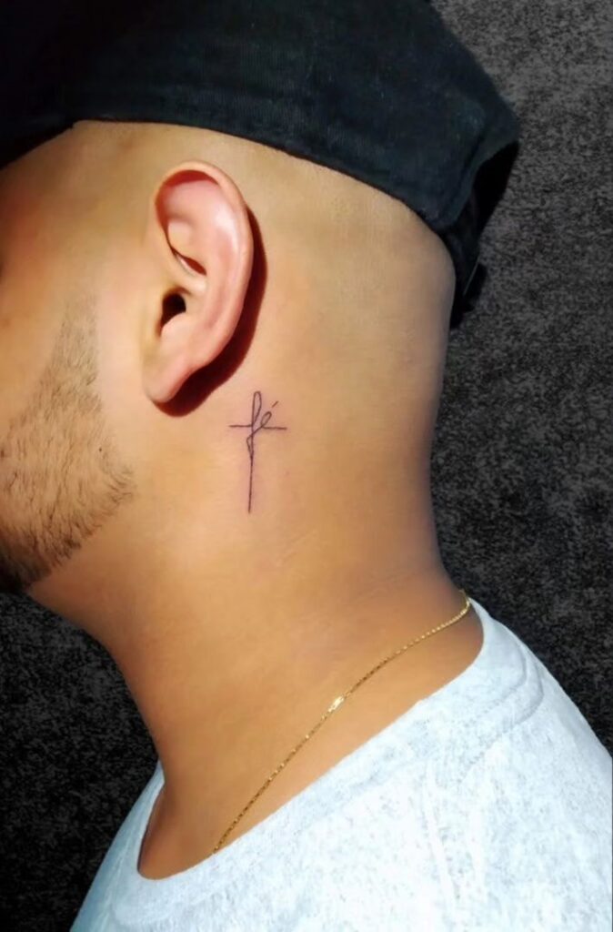 This delicate tattoo placed behind the ear features a minimalist cross with the word “fe” (meaning “faith” in Spanish or Portuguese) beautifully integrated into the design. The simplicity of the thin lines and subtle placement make this tattoo both understated and meaningful.