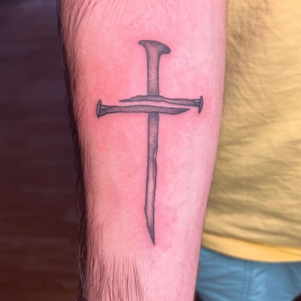 This striking tattoo features a cross constructed from two nails, symbolizing the crucifixion of Christ. The rugged, textured design of the nails adds a raw and impactful element to the piece, representing sacrifice, suffering, and ultimate redemption.