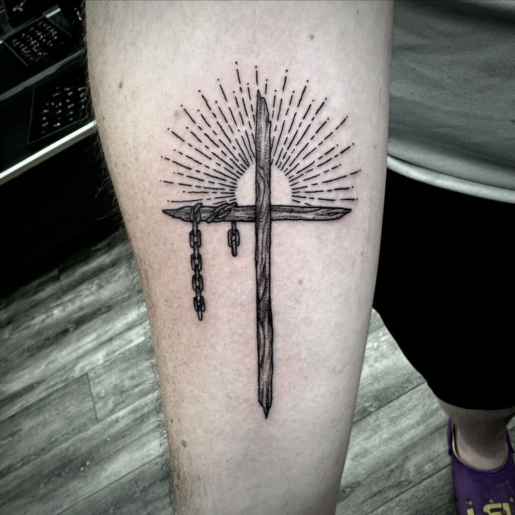 This tattoo design features a wooden cross with a broken chain hanging from one arm, symbolizing freedom and redemption. Behind the cross, radiant sunbeams spread outward, representing hope and divine light. The rustic style of the cross contrasts beautifully with the delicate lines of the sun, adding depth to the design.
