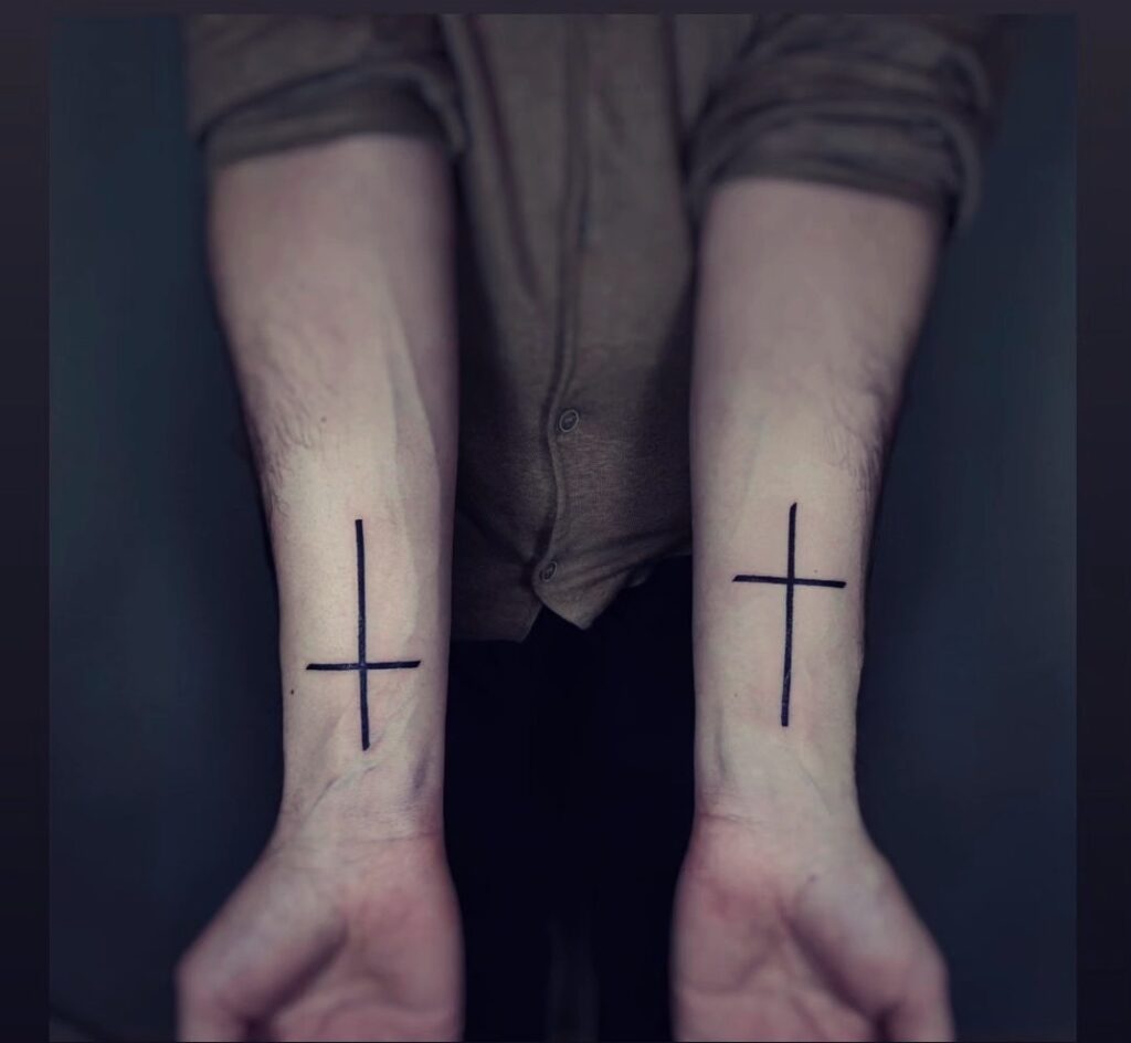 The image shows two simple black cross tattoos, one on each forearm, positioned symmetrically. Each cross is minimalistic with thin, clean lines, representing faith in a subtle yet powerful way. The placement on both arms enhances the symmetrical design, symbolizing balance and devotion.