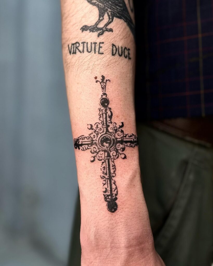 This beautifully detailed forearm tattoo features an ornate, baroque-style cross with elaborate embellishments. The swirling patterns and intricate designs give the cross a vintage, regal appearance, evoking a sense of timeless faith and artistry.