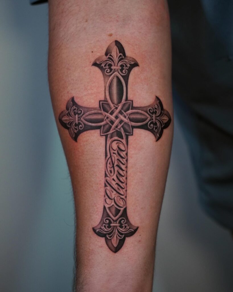 3. Ornate Cross with Name Inscription Forearm Tattoo