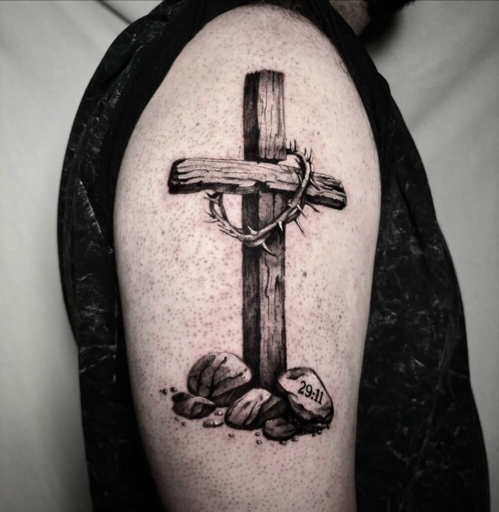 The inscription “29:11” on one of the stones references a biblical verse, further personalizing the design with a message of hope and faith. This tattoo is ideal for men looking for a meaningful expression of their Christian beliefs, reflecting both sacrifice and divine promise.