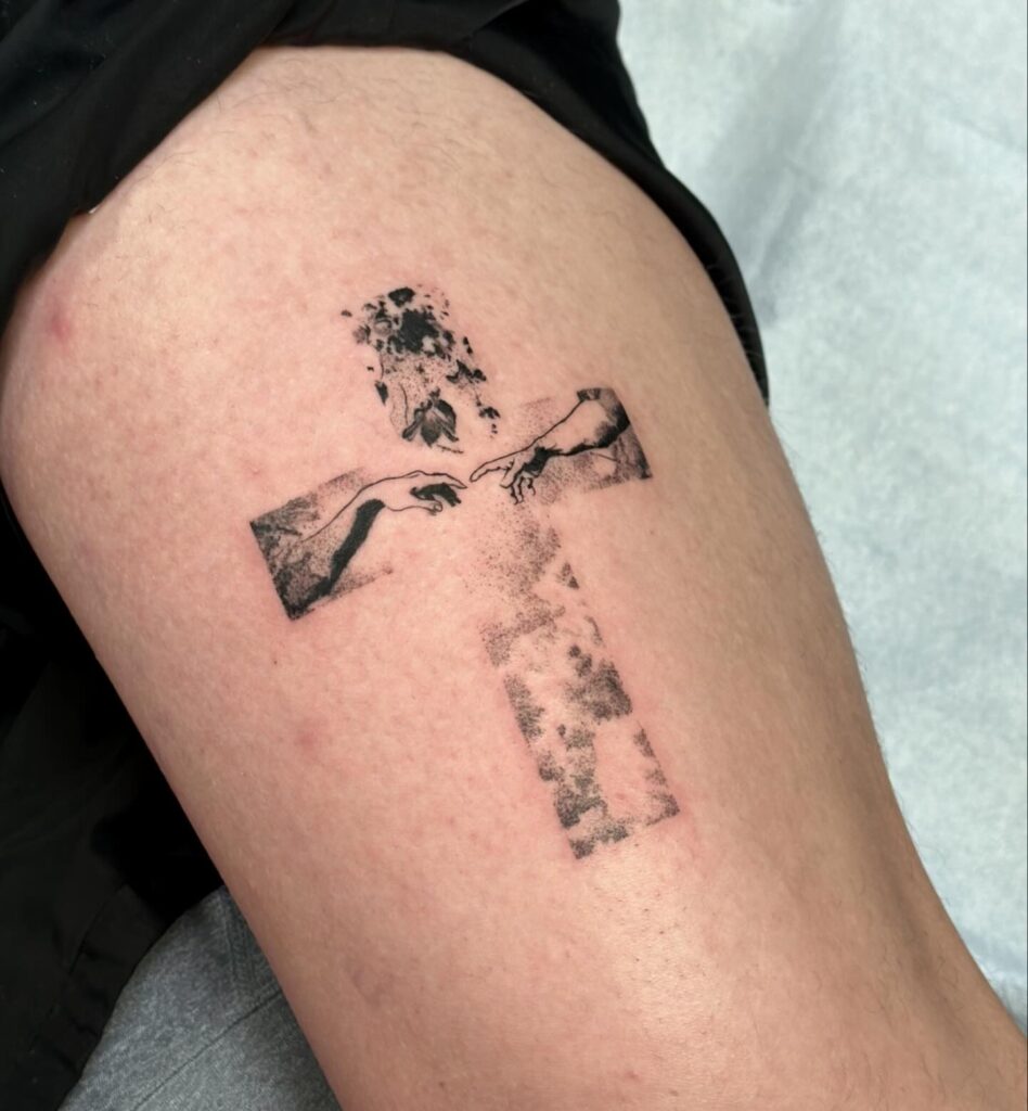 This artistic thigh tattoo incorporates the iconic hands from Michelangelo’s The Creation of Adam into the design of a cross. The hands, reaching toward each other, symbolize the divine connection between God and humanity. The cross itself features a faded and textured background, adding a sense of depth and timelessness.