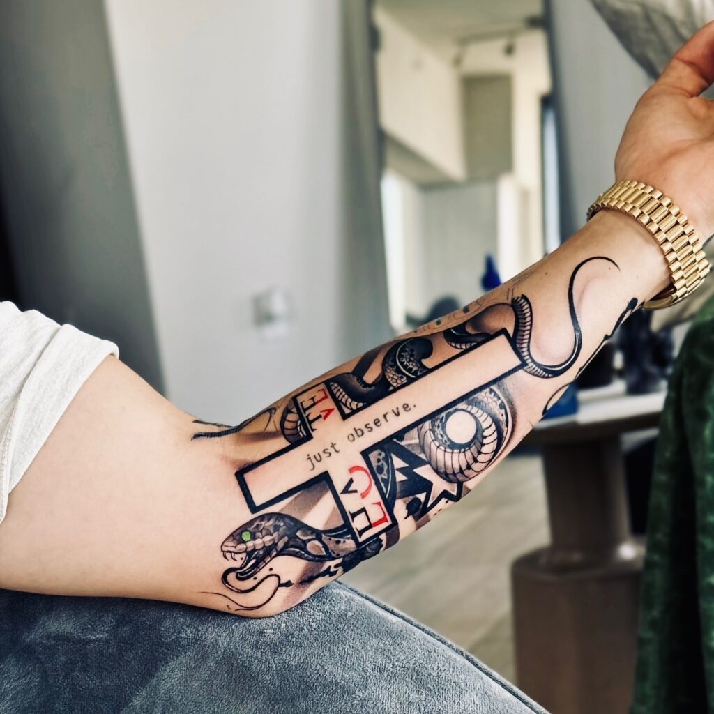 This forearm tattoo presents a striking cross at the center, adorned with the words “just observe” inscribed along the vertical line. The design is wrapped by an intricately detailed snake, symbolizing wisdom, temptation, or rebirth, creating a balance between faith and awareness.