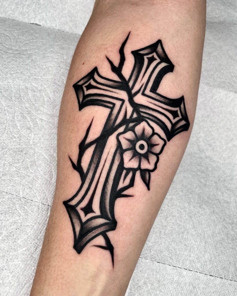 This tattoo features a bold, gothic-style cross with sharp, defined edges. The design is enhanced by a delicate flower at the base, adding a softer touch to the strong black lines of the cross. Twisting vines wrap around the cross, symbolizing growth and resilience.