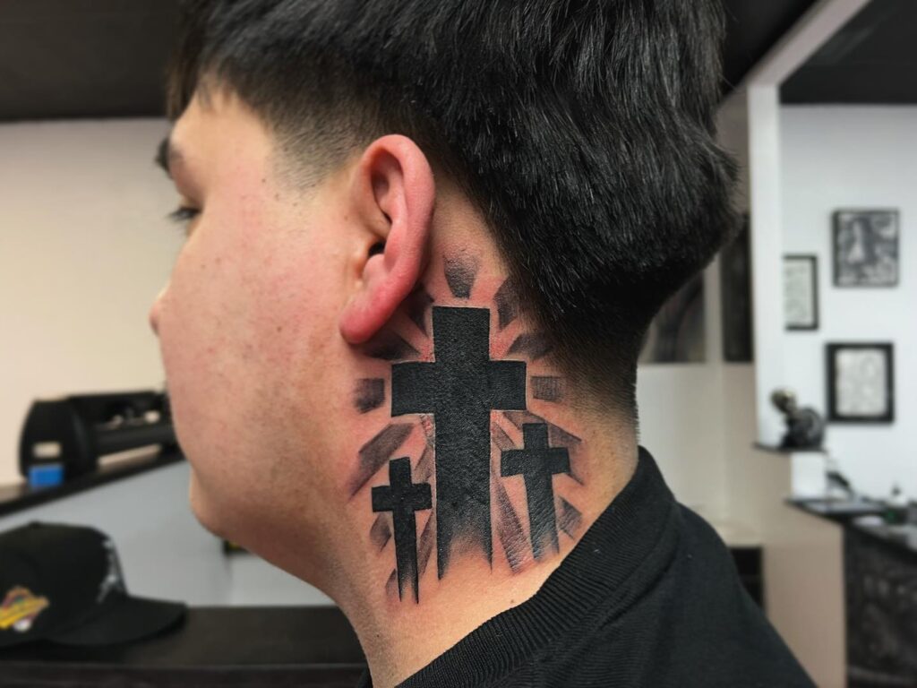 2. Bold Three Cross Neck Tattoo