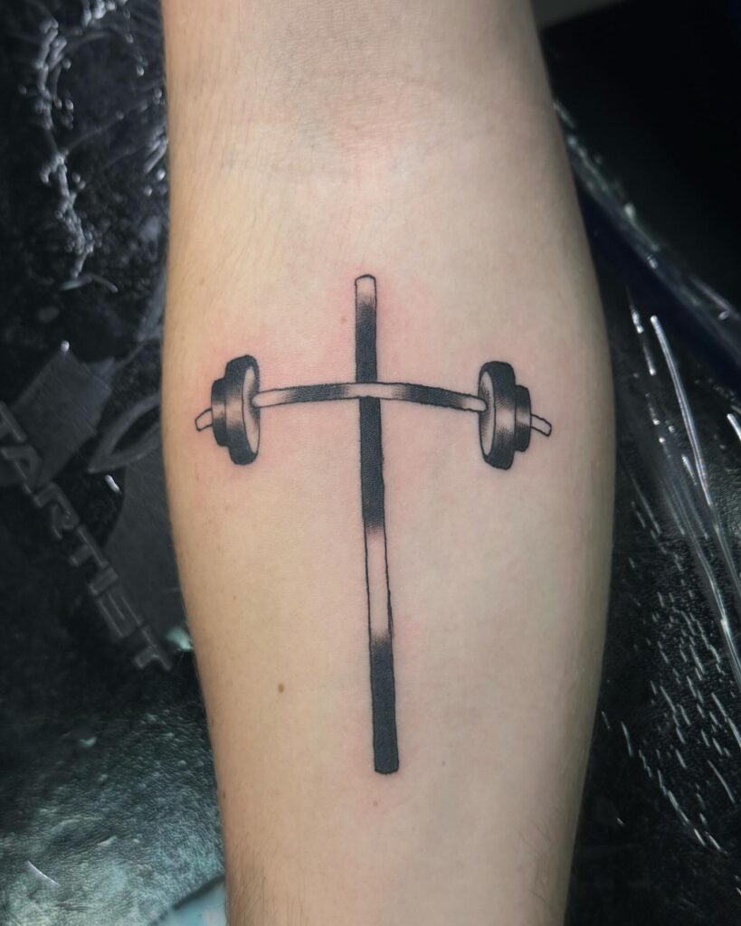 This creative tattoo combines the symbolism of a cross with a barbell, representing a powerful connection between faith and strength. The vertical beam of the cross is merged with the barbell, symbolizing physical and spiritual strength working in unison.