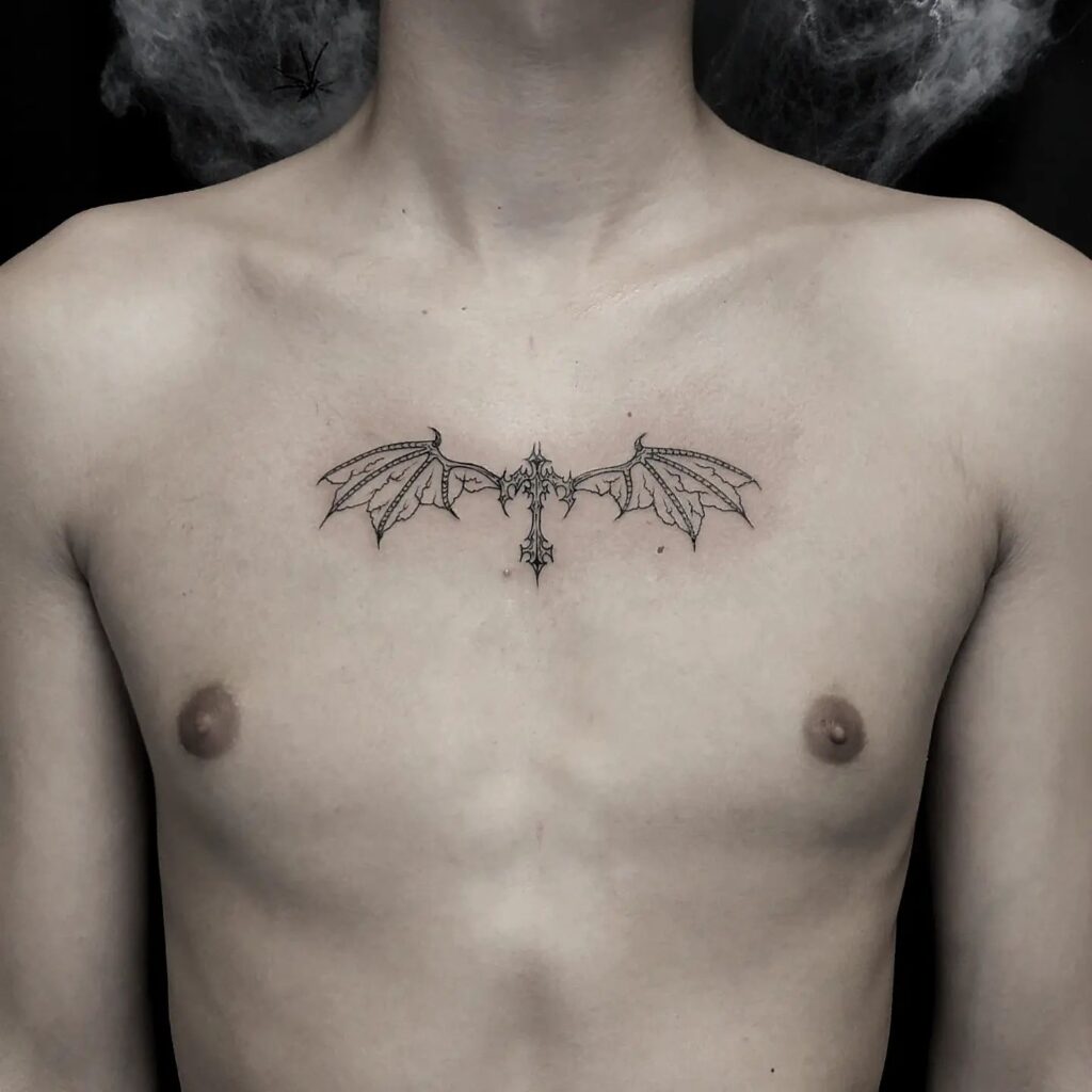 This striking chest tattoo features a detailed cross with bat-like wings extending from each side, creating a unique blend of religious symbolism and fantasy-inspired elements. The wings’ intricate design complements the cross’s sharp, gothic-style edges, giving the tattoo a dark yet elegant look.