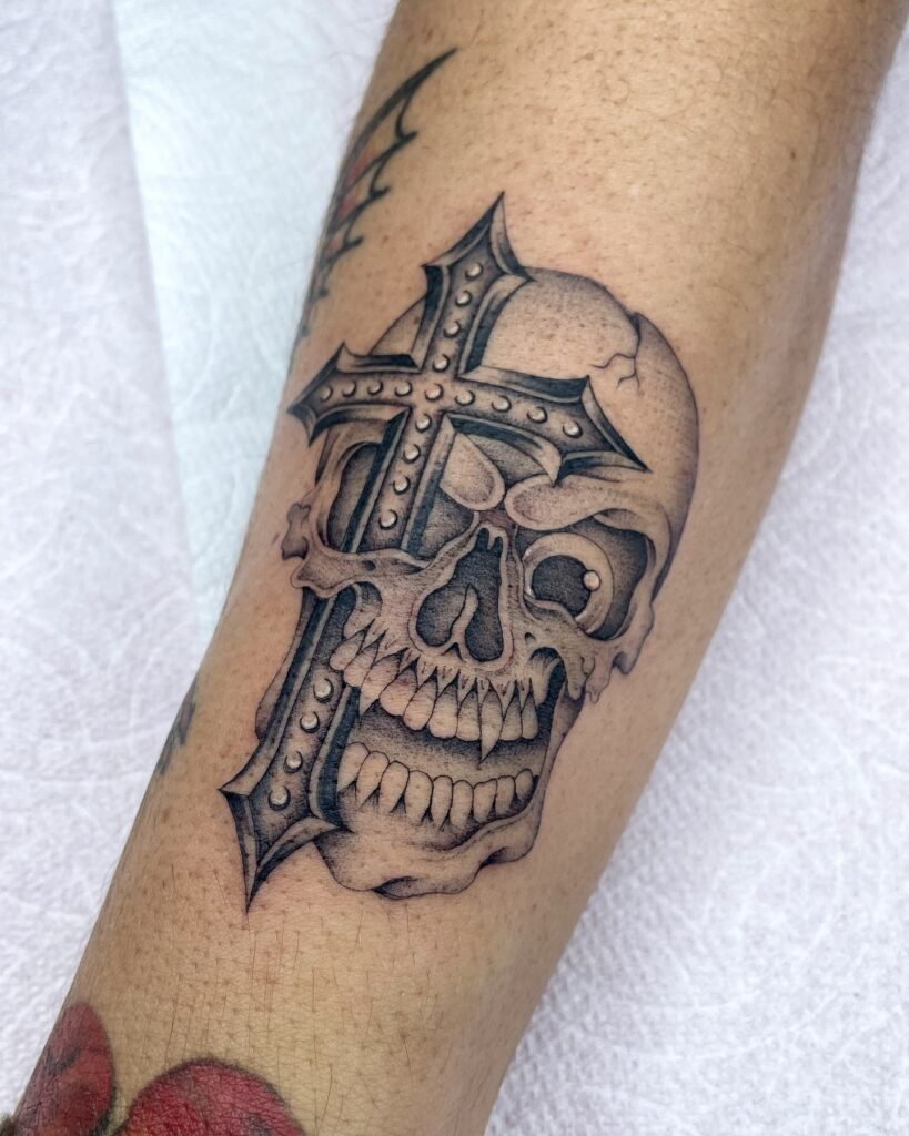 This fierce tattoo showcases a detailed skull design with an iron cross seamlessly integrated into the forehead. The cross is depicted with bold, studded lines, creating a powerful visual impact. The skull’s sharp teeth and menacing expression add to the intensity of the design.