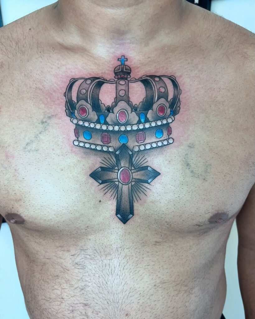 15. Crown and Cross Chest Tattoo