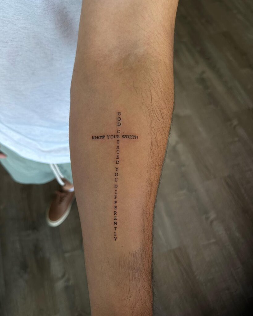 This unique forearm tattoo features a cross formed entirely from an inspirational message. The words “God created you differently” run vertically, while “Know your worth” forms the horizontal beam, creating a meaningful design that combines faith with personal affirmation.