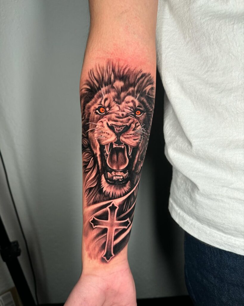This powerful forearm tattoo showcases a fierce, roaring lion, symbolizing strength, courage, and leadership. Below the lion, a bold cross is incorporated, representing faith and spiritual guidance. The intricate detailing in the lion’s face, particularly its sharp teeth and intense eyes, adds a sense of raw emotion and energy.