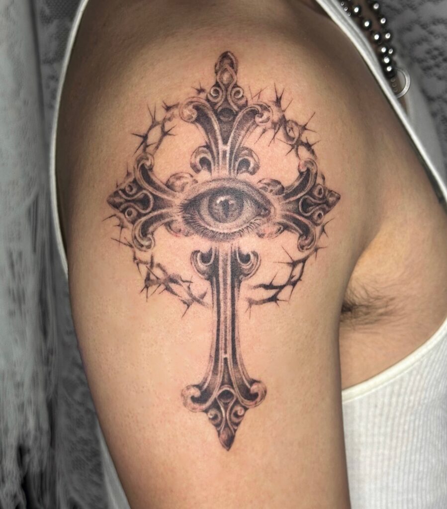 This bold upper arm tattoo features an intricate cross design with baroque-style patterns, centered around an all-seeing eye. Surrounding the cross is a crown of thorns, adding a dramatic and symbolic touch. The eye symbolizes awareness, divine guidance, or protection, while the thorns evoke sacrifice and endurance.