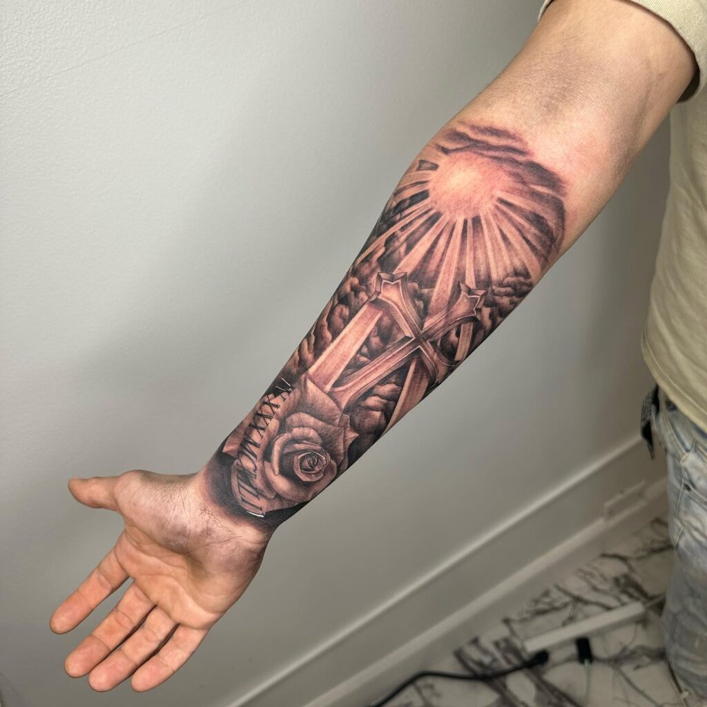 This detailed forearm tattoo features a prominent cross rising through clouds, symbolizing faith and hope. Radiant sunbeams shine from behind the cross, casting a heavenly glow. Below, a beautifully shaded rose adds a sense of love and remembrance, bringing depth to the design.