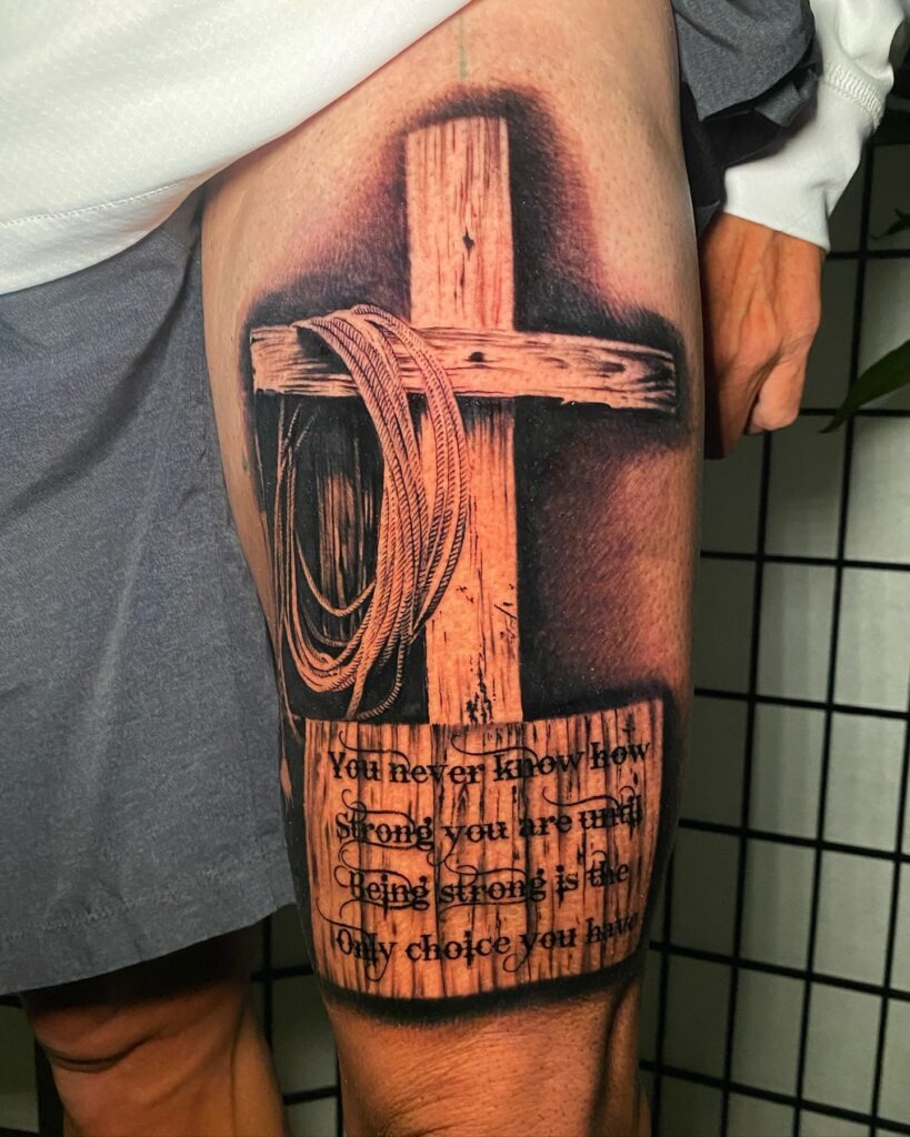 This thigh tattoo features a rustic wooden cross with a coiled rope hanging from it, symbolizing strength, resilience, and faith. The detailed wood texture adds depth and realism, giving the design a raw, natural feel.
