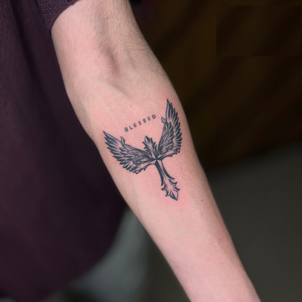 This elegant forearm tattoo features a beautifully detailed cross with angel wings spreading out from either side. The design symbolizes protection, spirituality, and guidance, with the word “Blessed” placed above the wings, adding a sense of gratitude and divine favor.