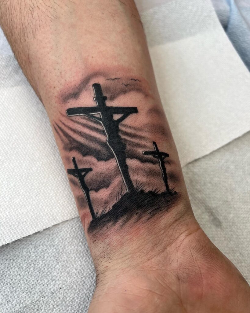This forearm tattoo depicts the powerful scene of Calvary, featuring the three crosses where Jesus and the two thieves were crucified. The central cross, with the silhouette of Jesus, is surrounded by dramatic clouds and rays of light, symbolizing hope and redemption.