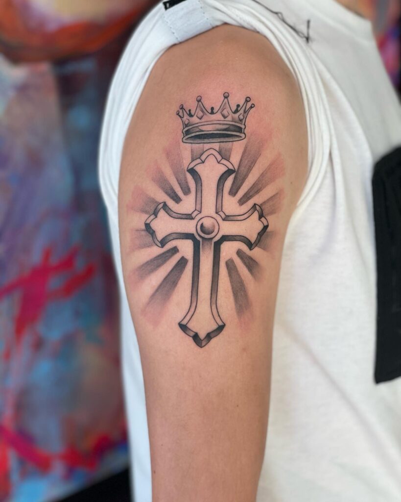 This bold upper arm tattoo features a prominent cross crowned with a regal design, symbolizing the power and divinity of faith. Rays of light radiate outward from the cross, emphasizing its significance and heavenly connection.