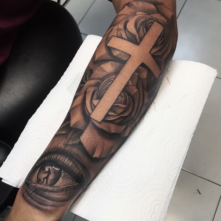 11. Cross with Roses and Eye Forearm Tattoo