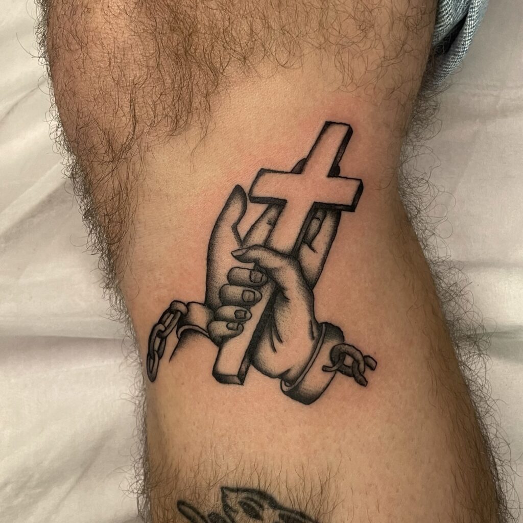 This bold tattoo features a hand gripping a cross, symbolizing unwavering faith and devotion. The broken chains wrapped around the wrist represent freedom from bondage or past struggles, signifying liberation through faith.