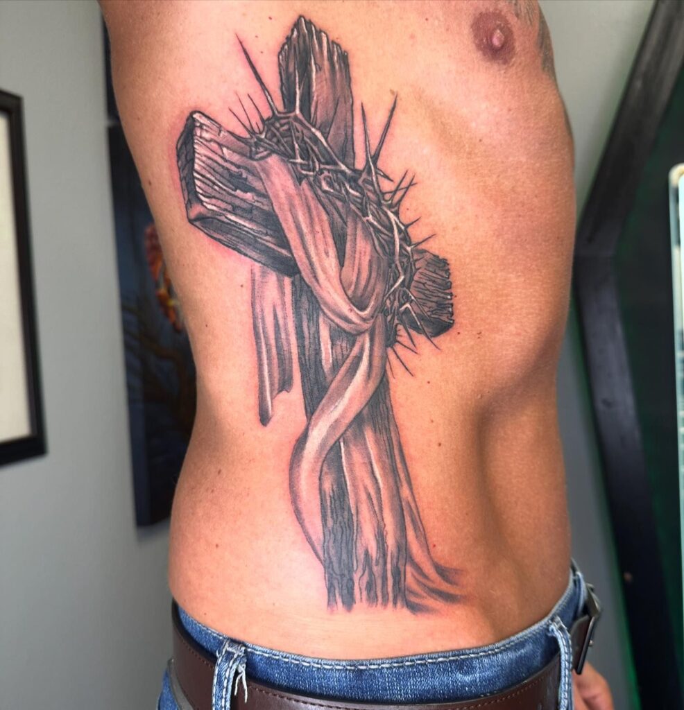 This detailed rib tattoo showcases a rustic wooden cross draped with a cloth and topped with a crown of thorns. The realistic texture of the wood and thorns adds depth and rawness to the design, symbolizing the suffering and sacrifice of Christ.