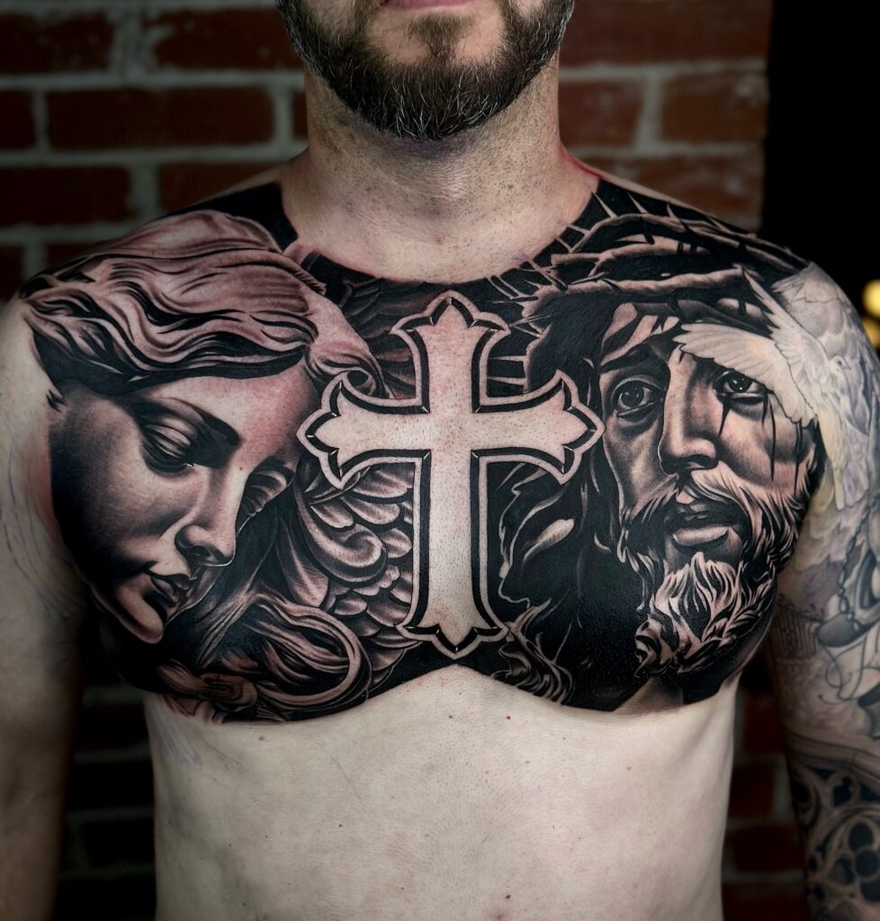 The shading work creates a dynamic contrast, emphasizing the depth of the design and the symbolism behind it. This tattoo is perfect for men seeking a powerful, full-chest piece that visually conveys their faith and personal connection to divine themes.