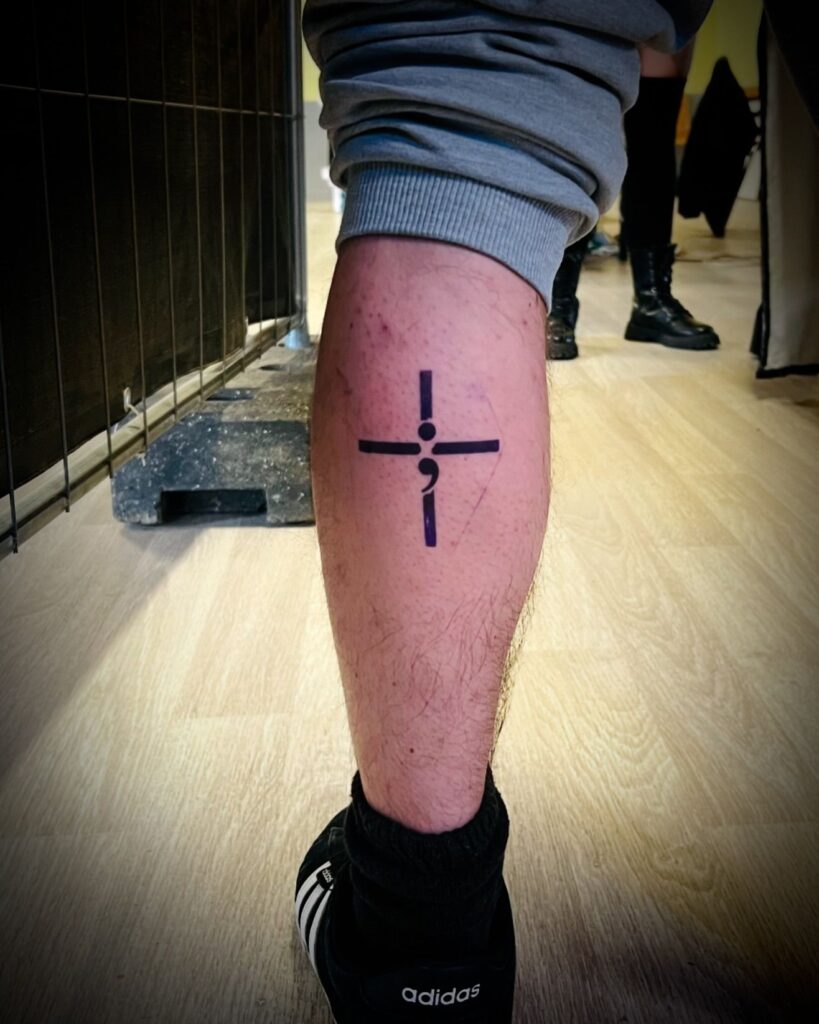 This striking tattoo features a minimalist cross design with a semicolon incorporated at the intersection. The bold lines and deep black ink make the symbol stand out, while the semicolon adds a meaningful touch, often representing mental health awareness and resilience.