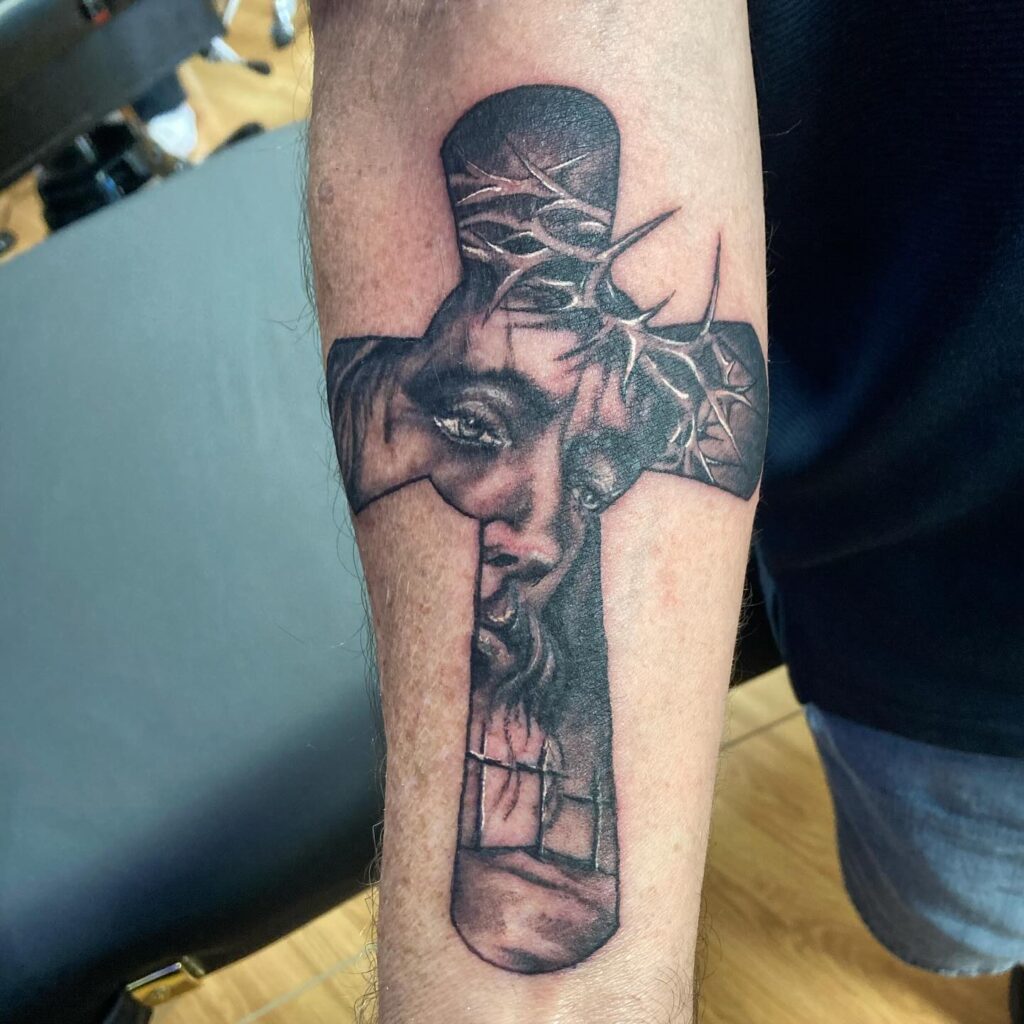 This forearm tattoo features a striking image of Jesus within a cross. The detailed depiction of His face, adorned with a crown of thorns, evokes deep emotion and reverence. The subtle shading highlights the somber expression, making the piece feel incredibly lifelike.