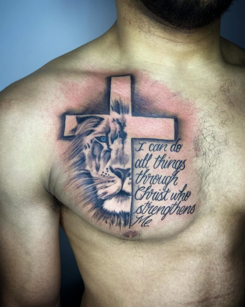 This chest tattoo features a bold cross with a lion’s face integrated into the design, symbolizing strength and courage. The lion, often associated with power and bravery, is paired with a religious quote, “I can do all things through Christ who strengthens me,” emphasizing faith and resilience.