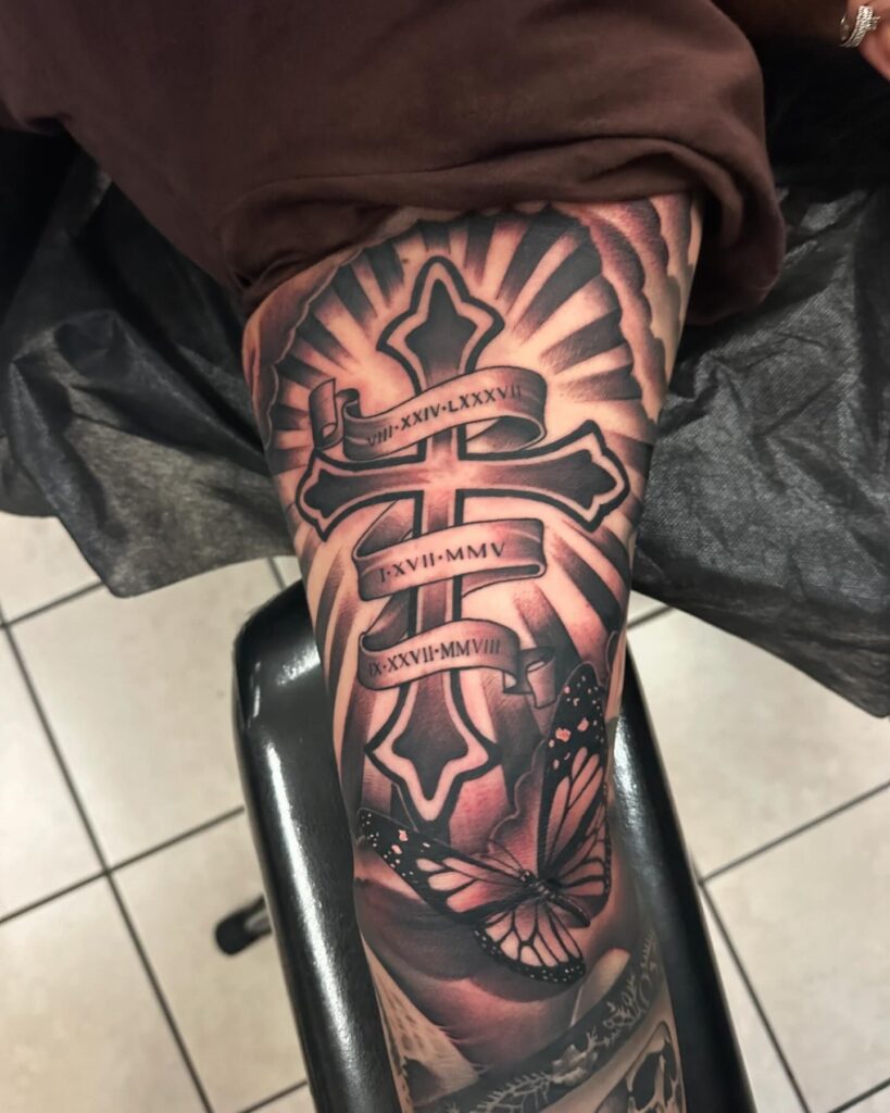 A detailed butterfly at the bottom represents transformation and new beginnings, complementing the spiritual meaning of the cross. The intricate shading and use of contrast add depth, making the design stand out. This tattoo beautifully combines faith, personal milestones, and the journey of growth and transformation.