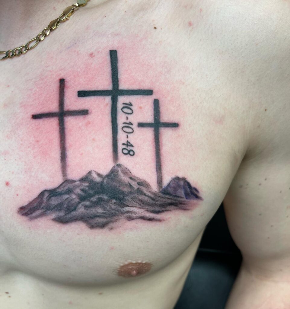 This tattoo showcases three crosses standing atop a rugged mountain landscape, symbolizing the crucifixion scene on Golgotha. The inclusion of the date adds a deeply personal or memorial touch, possibly marking a significant life event or honoring a loved one.