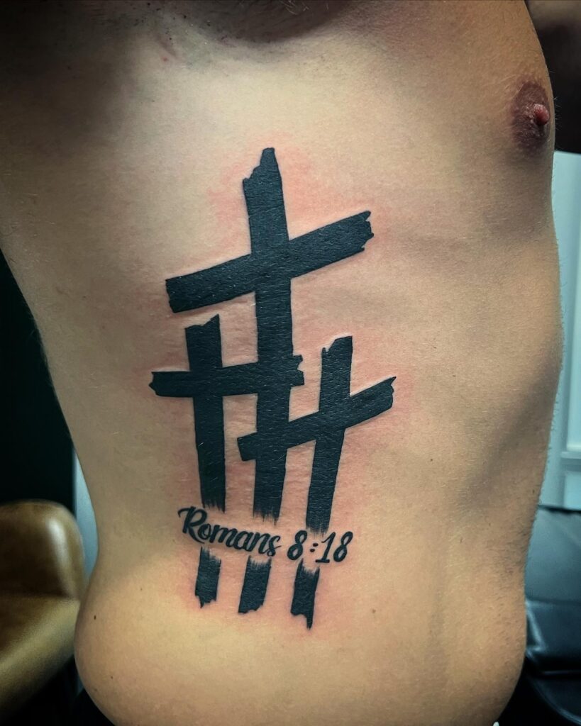 This tattoo features three large, bold crosses stacked in an overlapping arrangement, symbolizing faith and redemption. Below the crosses, the scripture reference “Romans 8:18” adds a spiritual and deeply meaningful touch, representing hope and perseverance through challenges.