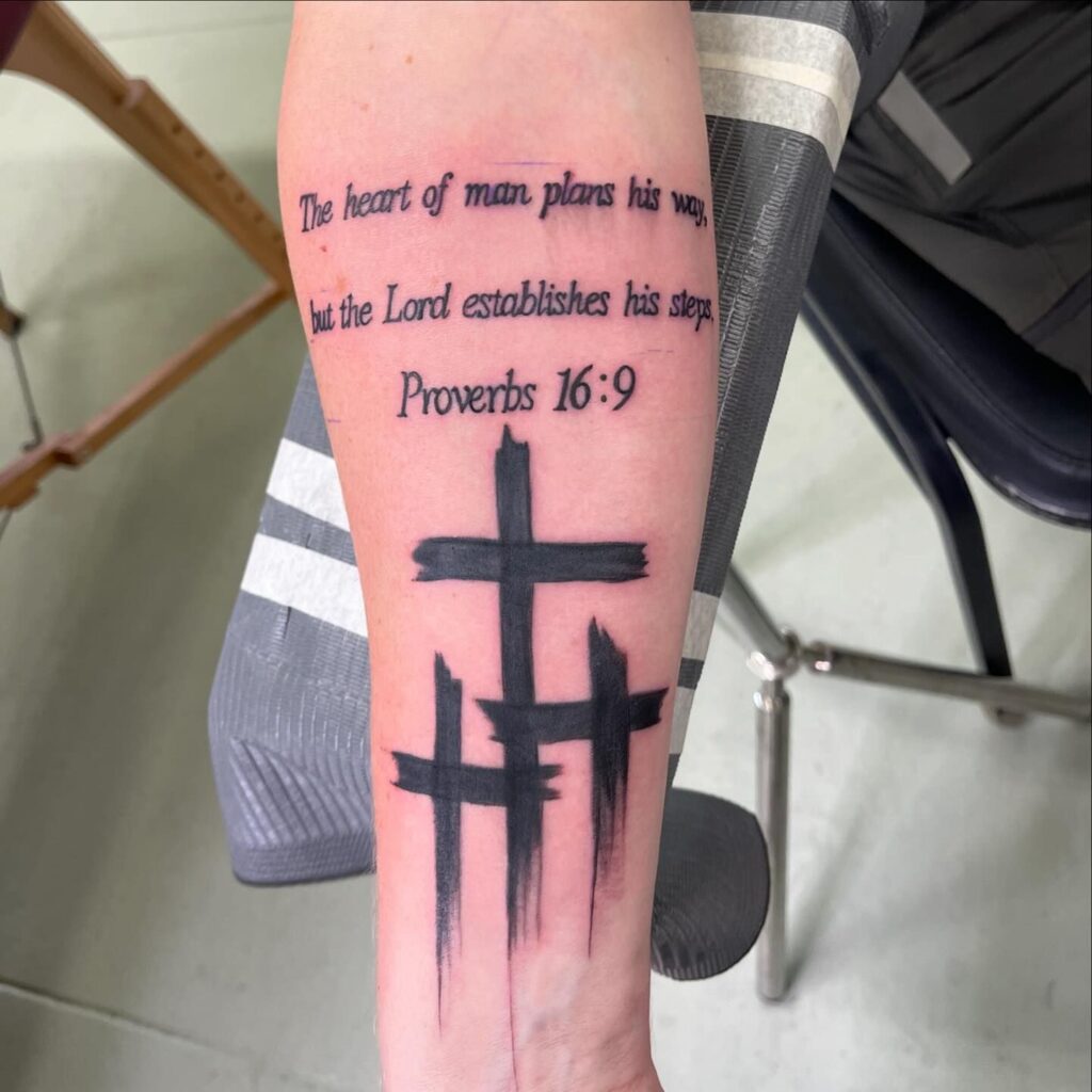 This tattoo beautifully combines a verse from Proverbs 16:9, “The heart of man plans his way, but the Lord establishes his steps,” with a striking depiction of three crosses. The bold, abstract design of the crosses symbolizes faith and divine guidance, while the scripture reinforces the message of trust in God’s plan.