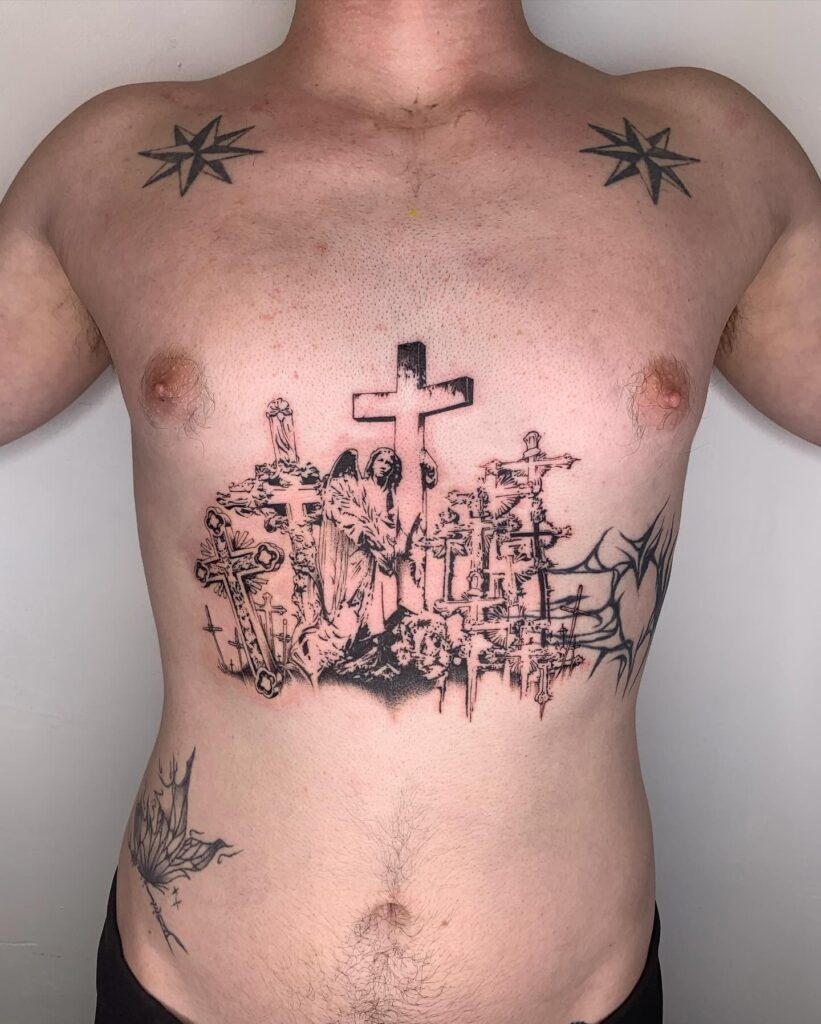 The various cross styles add depth and complexity, reflecting a profound connection to faith and honoring loved ones. Positioned prominently across the chest, this tattoo serves as a bold yet deeply meaningful piece, blending artistry with spiritual significance to create a truly captivating design.