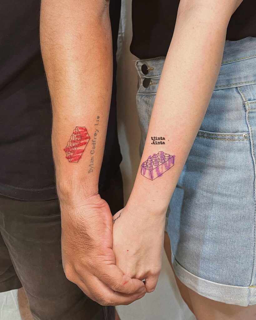 This playful and creative couple’s tattoo features two colorful Lego blocks, one red and the other purple, symbolizing how the partners perfectly “fit” together. The Lego pieces reflect a fun and strong bond, representing how each partner complements and completes the other.