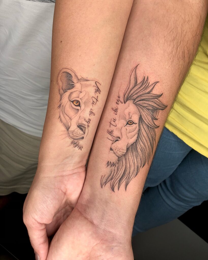 This couple’s tattoo features a lion on one forearm and a lioness on the other, symbolizing strength, loyalty, and unity. The designs include the phrase “Be the one” written next to each animal, adding a personal and meaningful touch.