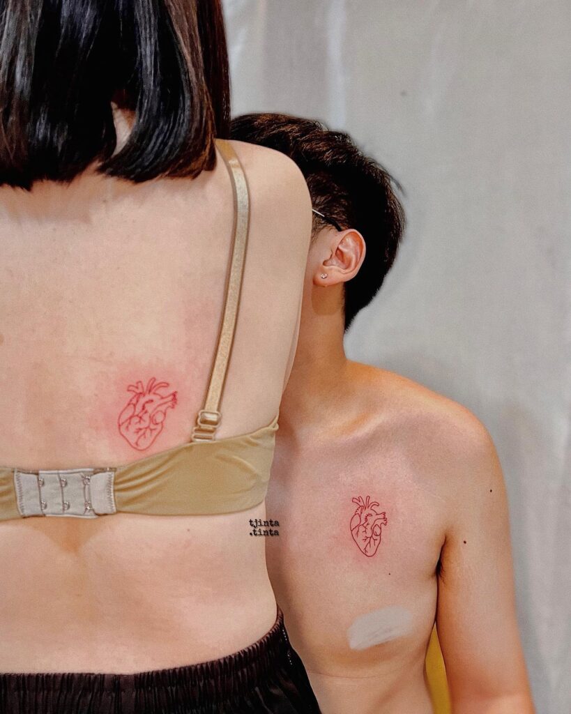 This couple’s tattoo features matching red anatomical hearts, symbolizing a deep and intimate connection. Positioned near the chest, the hearts reflect a shared vulnerability and openness, as if each partner is carrying a piece of the other’s heart. The anatomical design adds a realistic touch, emphasizing that their love is rooted in both emotion and reality.