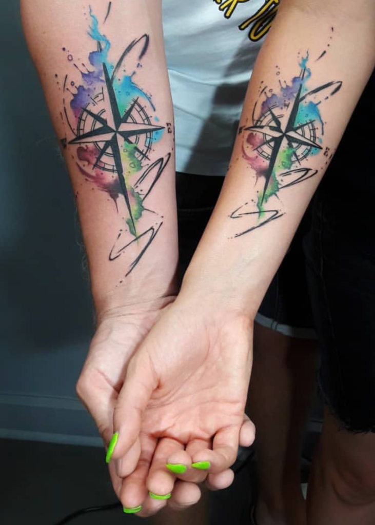 This tattoo features vibrant, matching compass designs, set against a watercolor background. The compass symbolizes direction, guidance, and a shared journey, representing how the couple navigates life together. The watercolor splashes in various hues—such as blue, purple, pink, and green—add a dynamic and artistic touch, symbolizing the colorful and adventurous nature of their relationship. The swirling lines around the compass enhance the sense of movement and exploration.